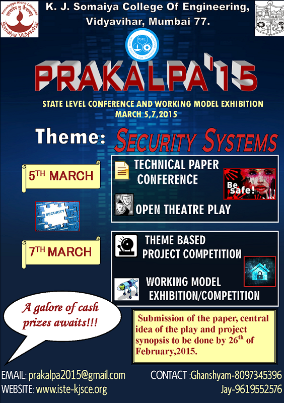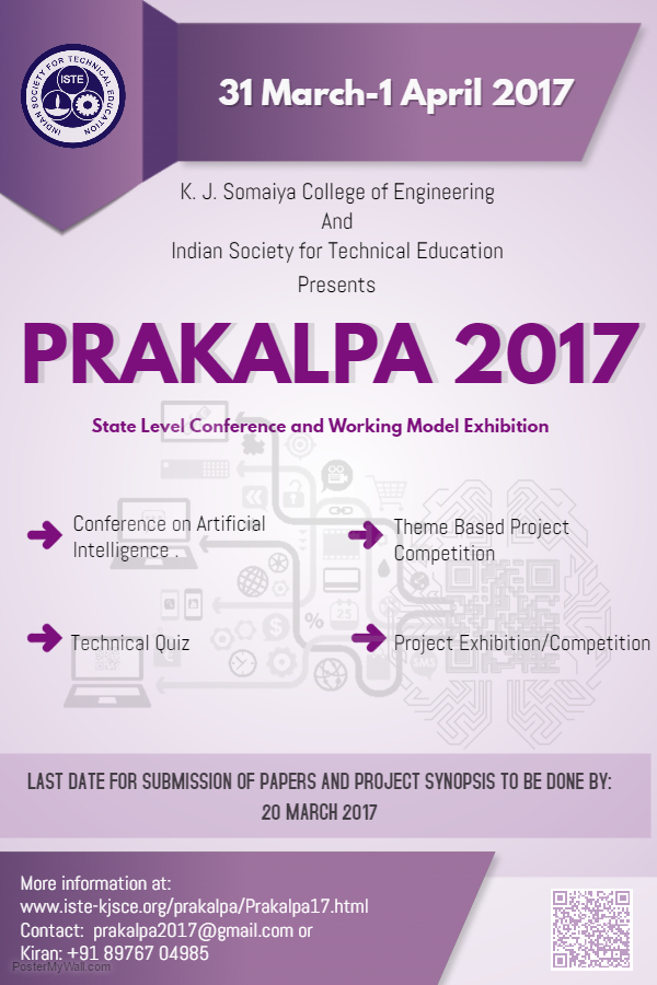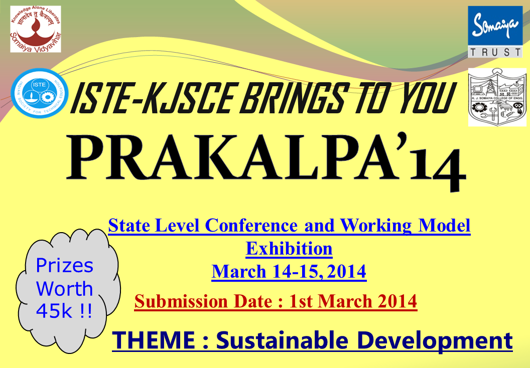 Prakalpa is a technical paper conference and working model/project competition organized by ISTE Council and K.J. Somaiya College of Engineering. This is a state-level competition which is conducted annually in K.J. Somaiya College of Engineering, Vidyavihar. This year prakalpa will be conducted on 18, 19 March, 2016. The competition is being organized since 2006 and now becoming more and more popular among the students