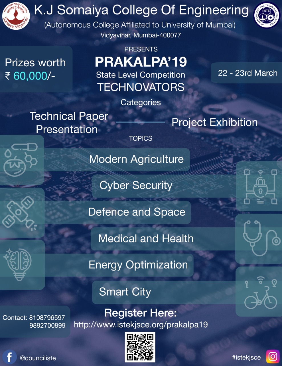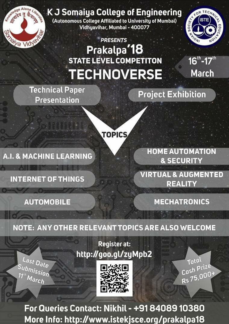 Visit WebsitePrakalpa is a State level Competition organized by K. J. Somaiya College of Engineering and the ISTE Student Chapter KJSCE since 2006.This year, Prakalpa includes Technical Paper Presentation (30th March) along with Working models exhibition (31st March).