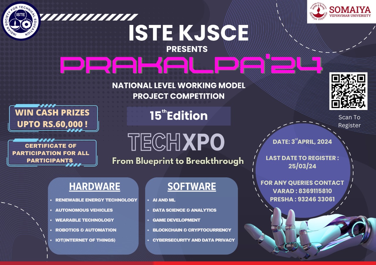ISTE-KJSCE is organizing the 14th PRAKALPA event on 13th April 2023. Open to all UG / PG students of engineering colleges, this national-level competition involves presenting technical abilities, exchanging new ideas, and implementing teamwork. PRAKALPA is a state-level competition that includes technical paper presentations and a working model project exhibition organized by ISTE Students' Chapter at K J Somaiya College of Engineering annually.