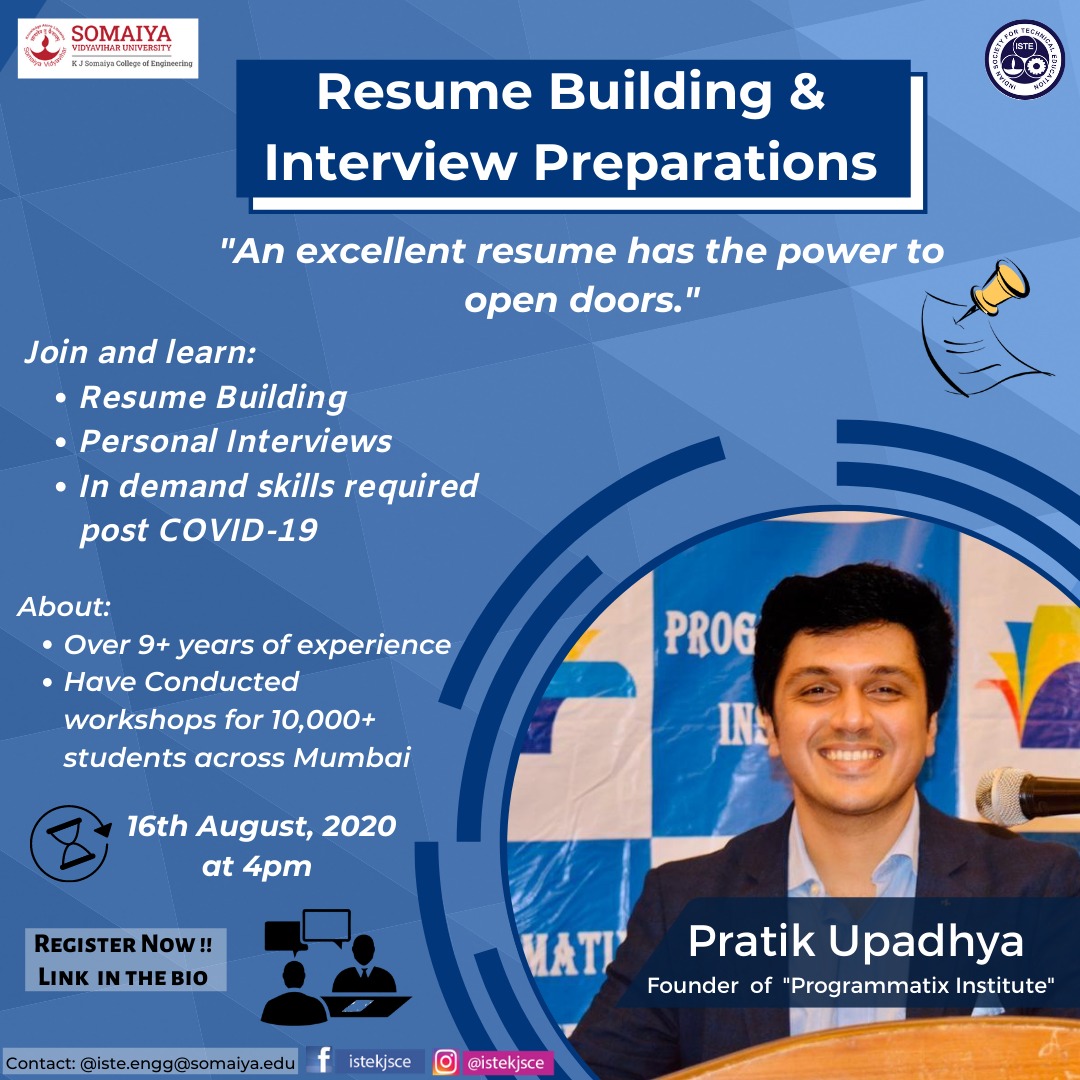 We are hosting an exclusive workshop by Mr. Pratik Upadhya (owner of Programmatix) on ‘Resume Building ’